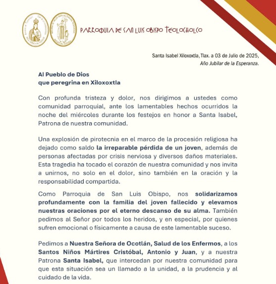 Tras la explosión de pirotecnia ocurrida la noche del 2 de julio en Santa Isabel Xiloxoxtla, que cobró la vida de un joven de 16 años, identificado como Luis Enrique, la Diócesis de Tlaxcala emitió un pronunciamiento en el que expresó su solidaridad con los familiares de la víctima y exhortó a autoridades y feligreses a redoblar esfuerzos para prevenir este tipo de tragedias.