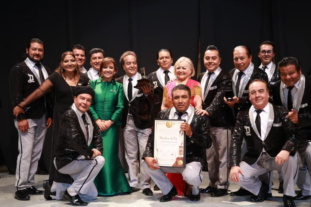 La gobernadora Lorena Cuéllar y la presidenta de la Asociación Nacional de Locutores, Rosalía Buaún Sánchez encabezaron la entrega del Micrófono de Oro 2025 a al Coro Yumhú de Ixtenco, a Humberto Cravioto, cantante vernáculo y tenor; Fernando Sánchez Nava; atleta tlaxcalteca paralímpico.